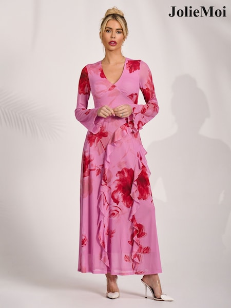 Jolie Moi Long Sleeve Ruffle Mesh Maxi Dress